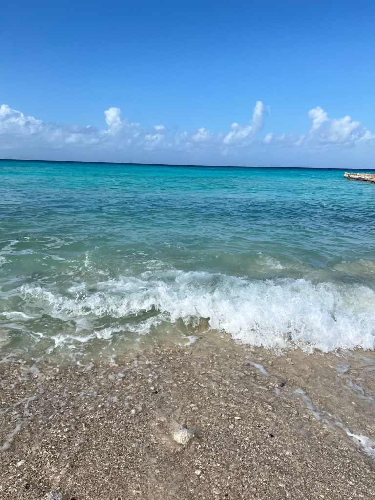 When you stand in the water you can see straight down to the bottom (about the only kind of water I will stand in!) and it’s beautiful. The sand doesn’t hurt your feet like other beaches. The surf is beautiful and relaxing.